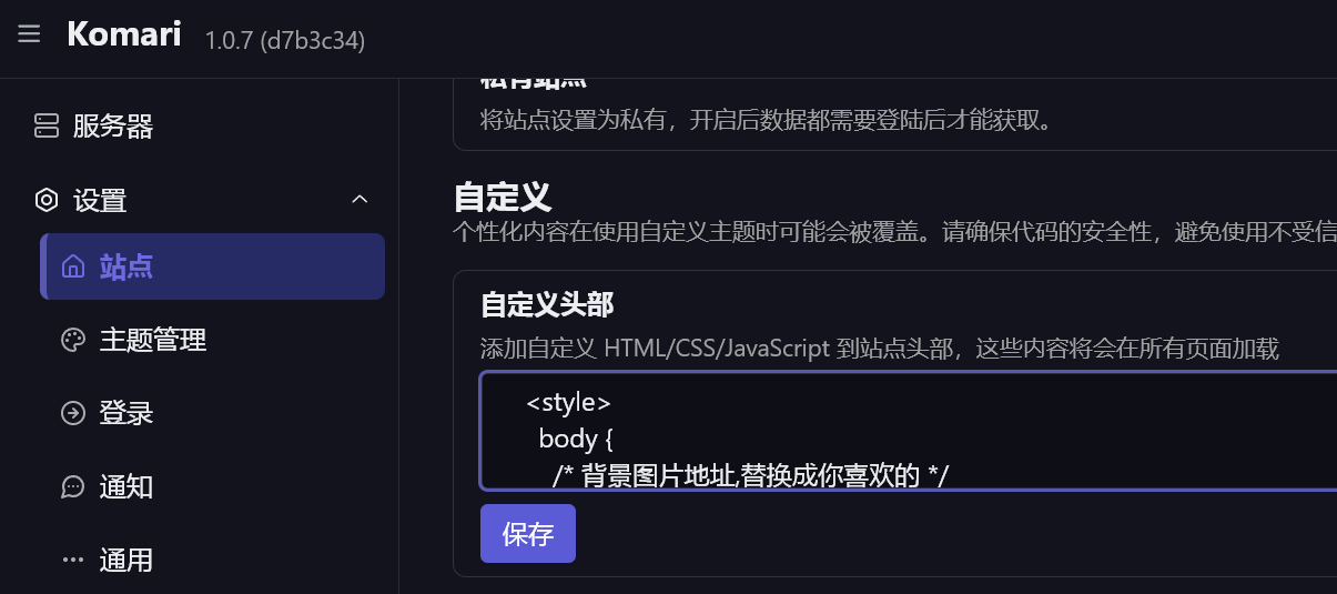 最好打开跨域请求开关,并关闭私有模式,这对以后的基于 Komari 的 API 服务非常有帮助 (当然并不强制)