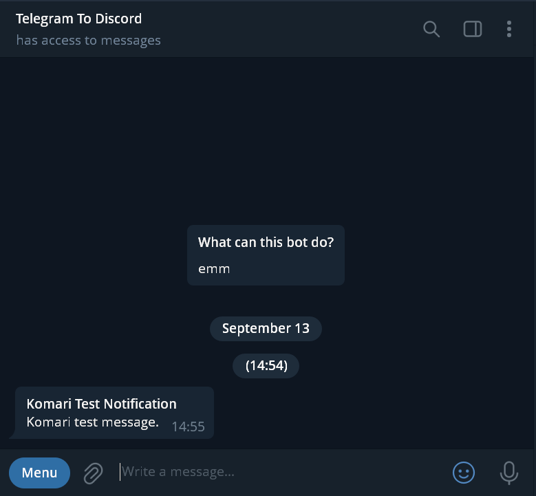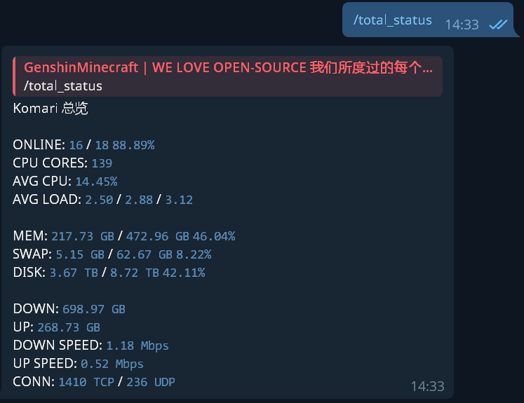 Komari 提供了非常多的同时发送渠道,我建议使用 Telegram Bot 或者 @komaritgbot 提供的通知服务,这样查询与通知可以绑定在一个 Bot 内