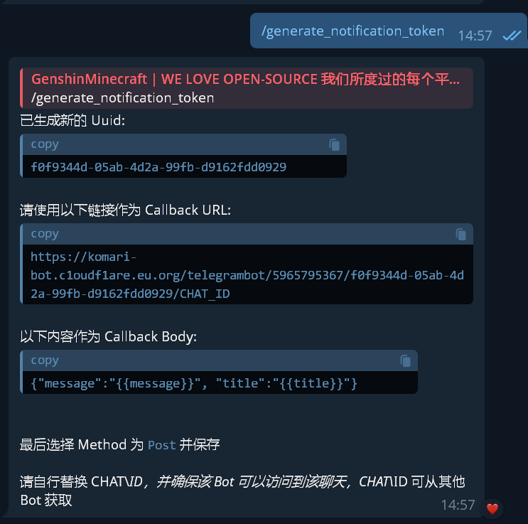 在通过本文教程 安装之后-连接到 Komari Telegram Bot 绑定服务器后,发送 /generate_notification_token: