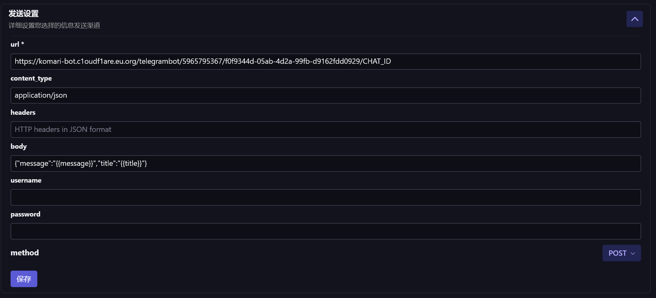 来到 Komari 后台 设置-通知,打开通知总开关,通知渠道选择 webhook,并在下方填入你的信息,请记得将 method 改为 POST: