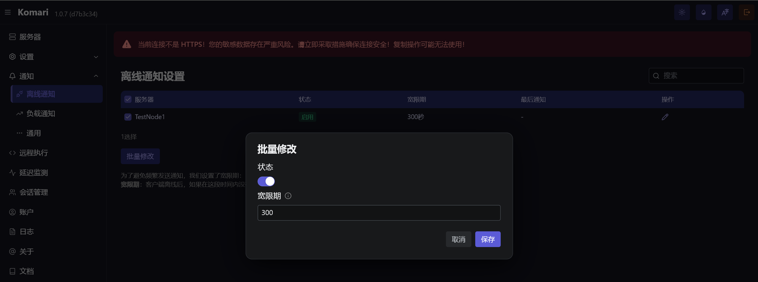 来到 Komari 后台 通知-离线通知,可以选择服务器批量进行修改:
