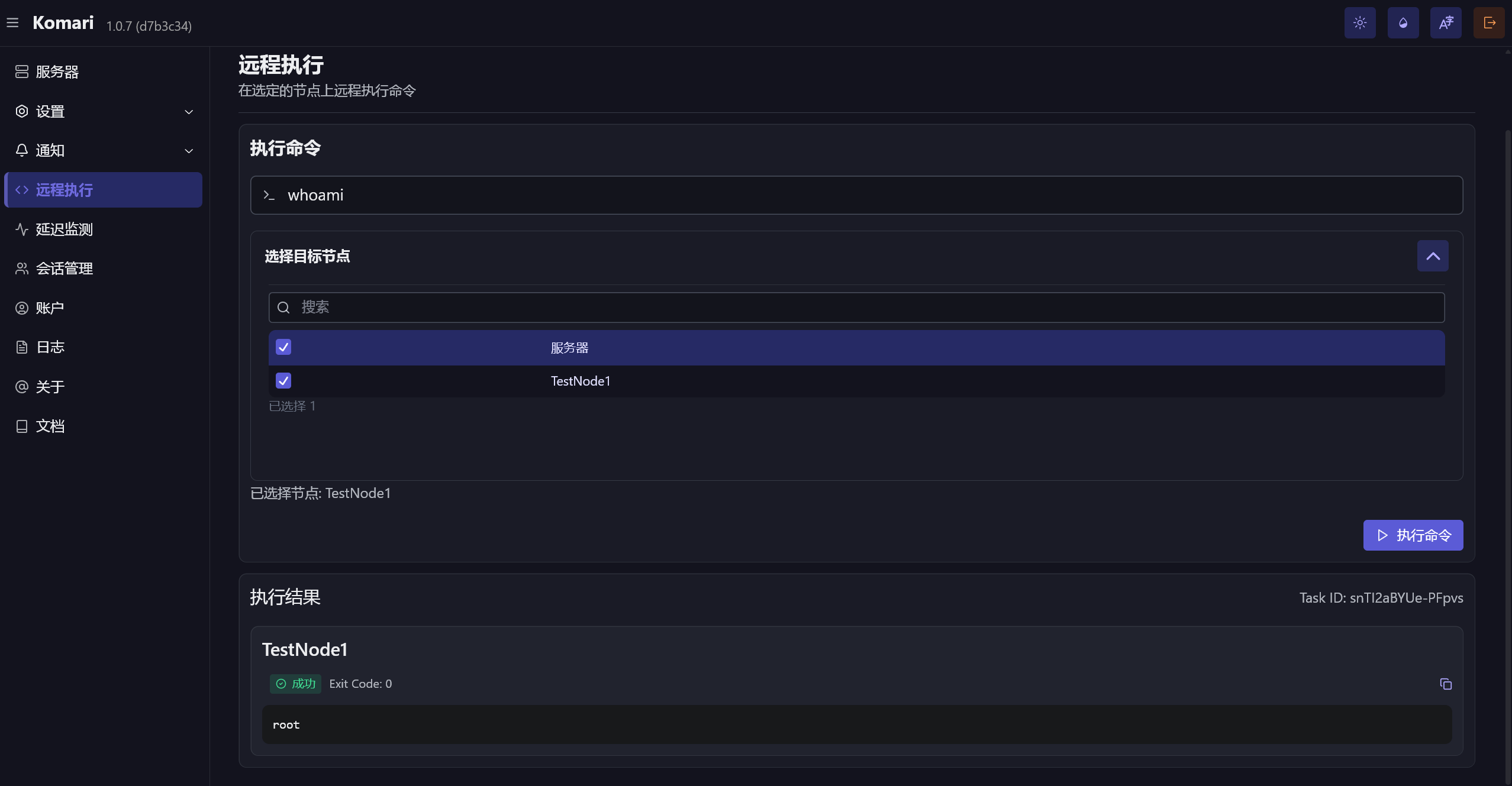 在 Komari 后台 远程执行 中可以批量让服务器运行命令