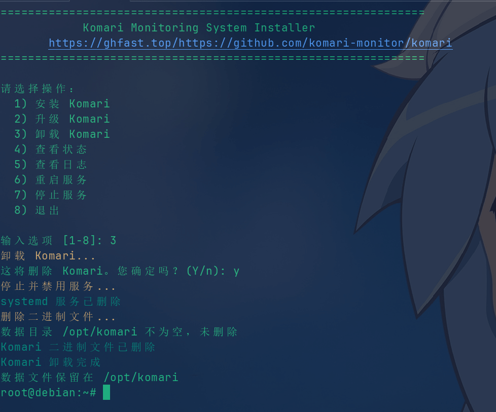 若你是使用的一键脚本安装 Komari,直接使用一键脚本卸载即可: